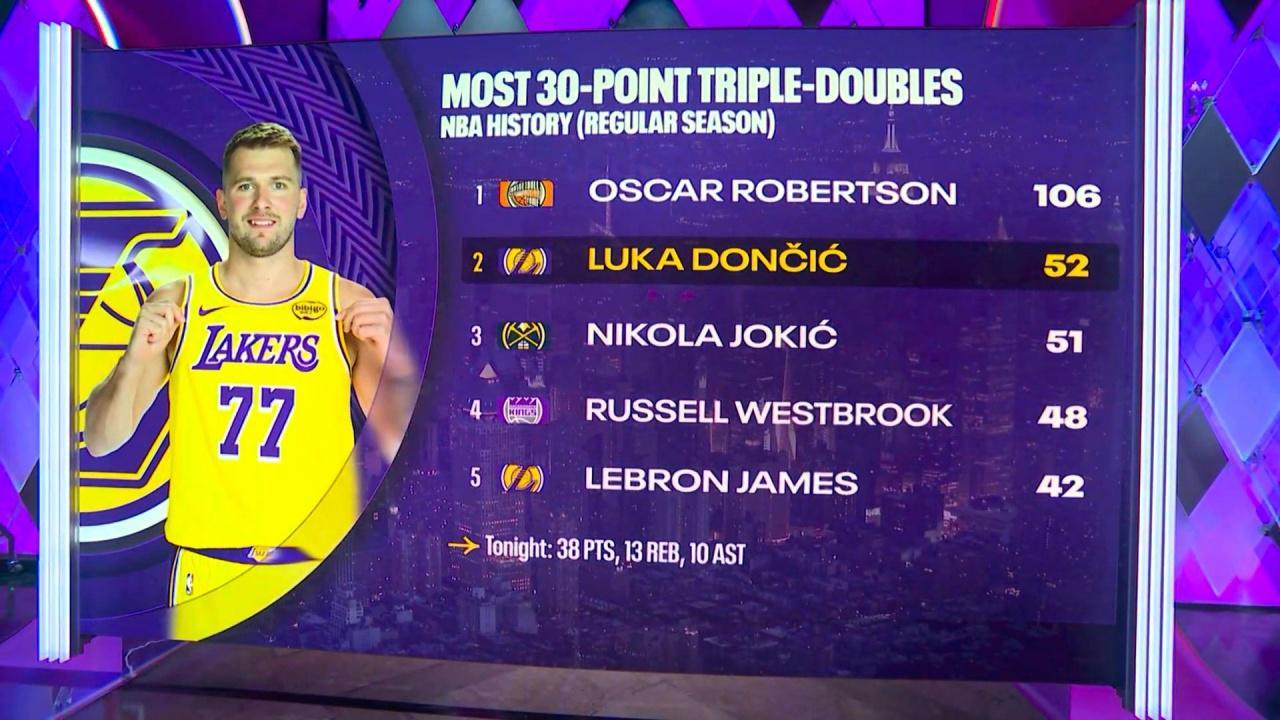 这是东契奇生涯第52次单场交出30+三双表现,成功超越约基奇升至NBA历史第二,仅次于大O的106次。