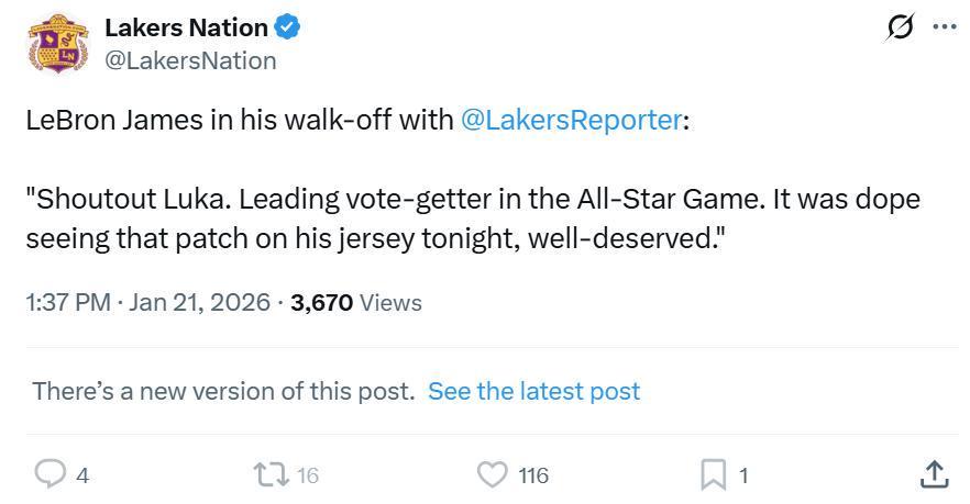 在本场比赛开始前,湖人队官方宣布东契奇的球衣上将带有全明星徽章。